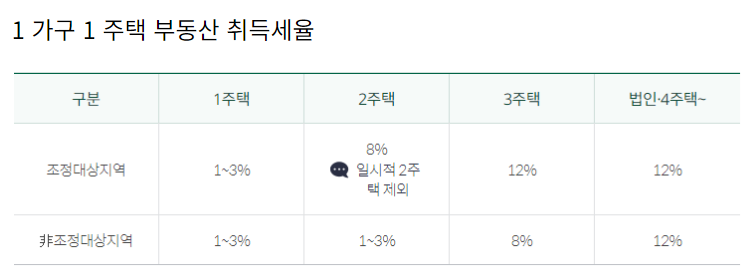 조정대상지역이라면 취득세율은 달라집니다. 조정대상지역 1주택이라면 1~3%, 2 주택의 경우 8%, 3 주택의 경우 12%의 취득세율이 적용됩니다.