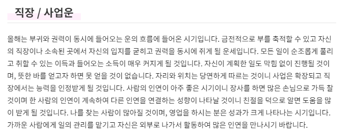 또한 월별 운세를 제공하기 있기 때문에 새로운 일을 시작하거나, 중요한 결정을 앞두고 있을 때 재미로 보시면 좋으실 것 같습니다.